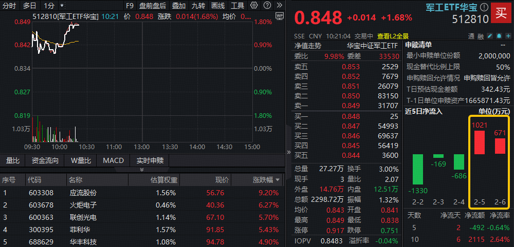 高人气军工ETF华宝(512810)高开后震荡拉升,一度涨至1.8%,此前2个交易日近1700万元资金进场。