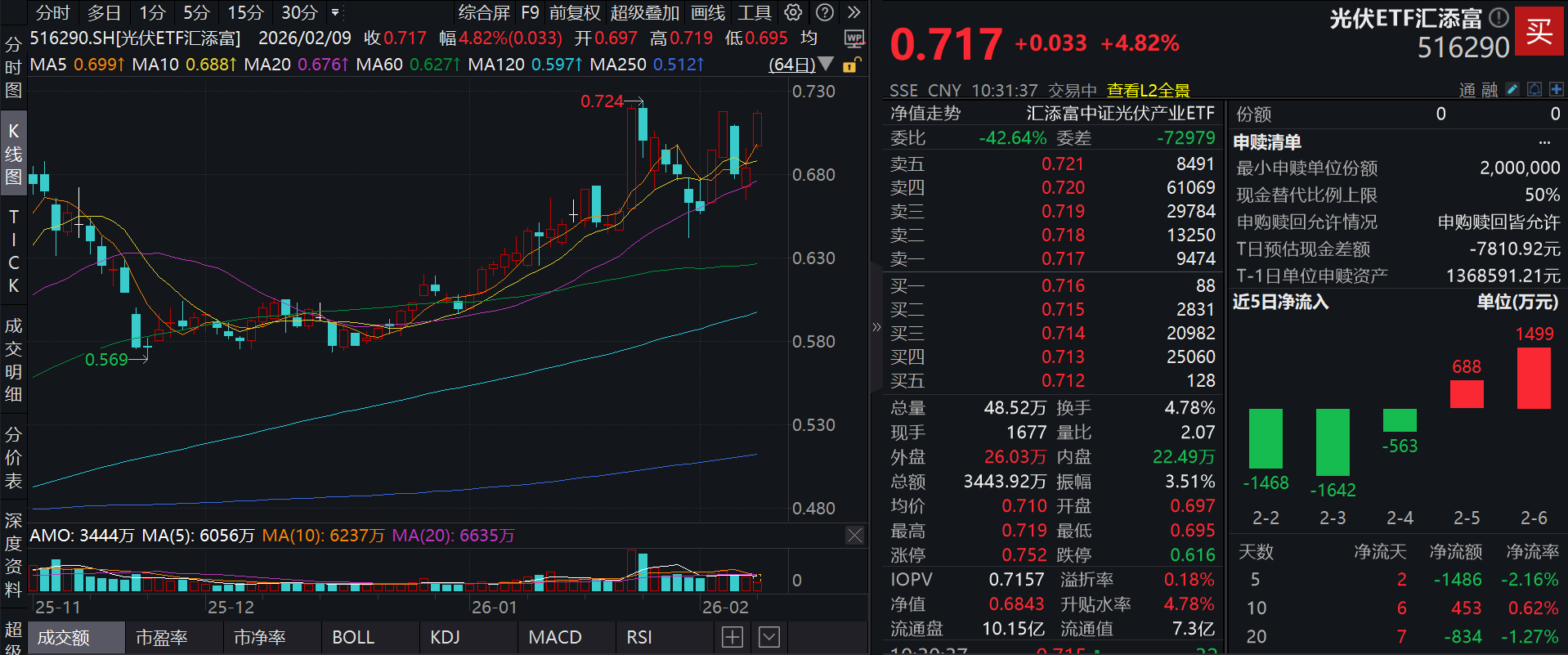 今日(2.9),太空光伏热度高涨,同类光伏最低档的光伏ETF汇添富(516290)飙涨近5%!成交额再度放量,盘中成交4000万元!资金已连续2天净流入!