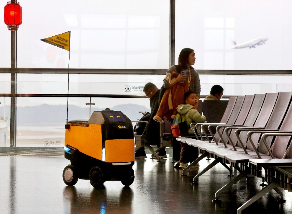 美团“小黄蜂”上岗南京机场,旅客在登机口也能“点外卖”(管乐 摄)