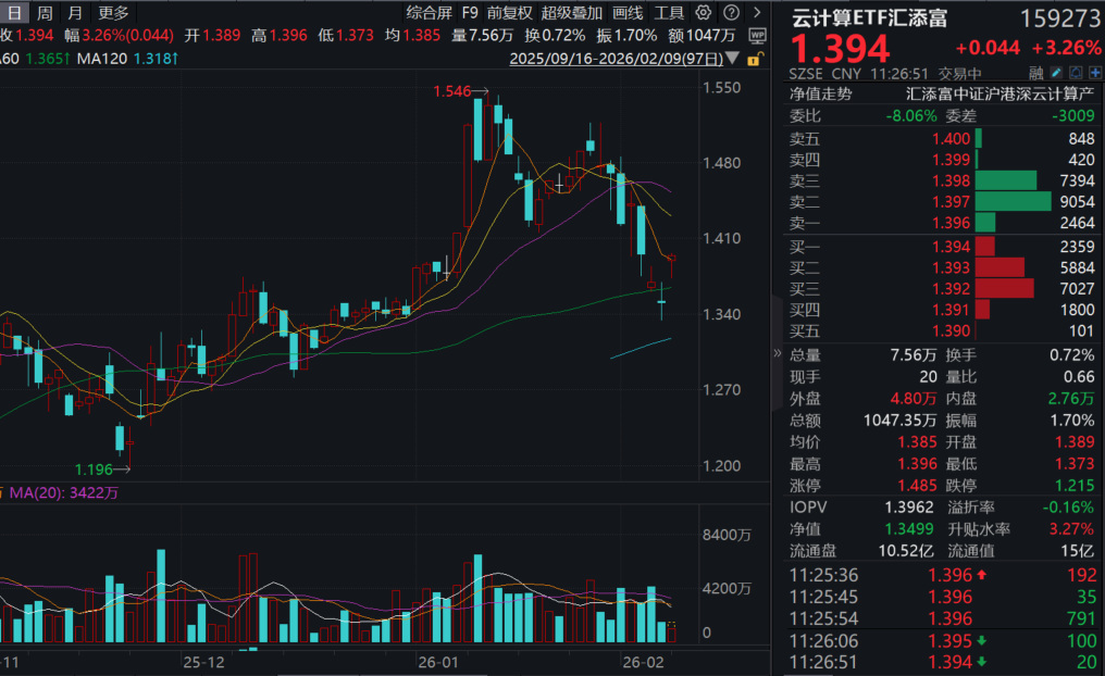 2月9日,A股全线反攻,两市超4400只个股上涨,算力概念延续上周强势,“算力ETF”云计算ETF汇添富(159273)大涨超3%!资金持续青睐,近20日狂揽近1.7亿元!热门成分股中,新易盛涨超7%,中际旭创、,网宿科技涨超4%、阿里巴巴-W涨超2%,腾讯控股涨超1%。