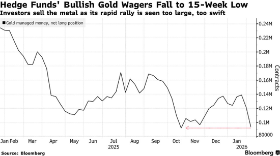 截至2月3日当周,对冲基金和其他大型投机商将黄金的净多头头寸减少了23%,至93438份合约。美国政府上周五公布的数据显示,这一水平为15周以来的最低水平。