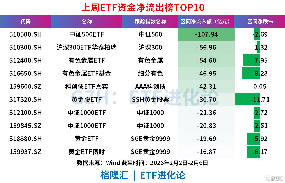 中证500ETF、沪深300ETF华泰柏瑞、有色金属ETF、有色金属ETF基金、科创债ETF嘉实、黄金股ETF上周分别净流出107.94亿元、56.96亿元、54.60亿元、46.95亿元、42.31亿元、30.70亿元。