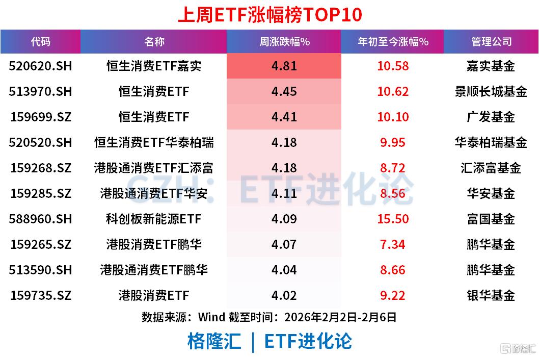恒生消费ETF嘉实、恒生消费ETF、恒生消费ETF、恒生消费ETF华泰柏瑞、港股通消费ETF汇添富、港股通消费ETF华安、科创板新能源ETF、港股消费ETF鹏华上周分别涨4.81 %、4.45 %、4.41 %、4.18 %、4.18 %、4.11 %、4.09 %、4.07 %。