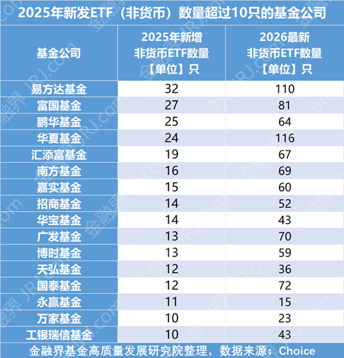 市场的蓬勃发展,离不开专业机构的持续投入。从基金管理人视角来看,2025年堪称ETF产品新发“大年”。易方达基金全年新发32只ETF,位居行业榜首;富国基金、鹏华基金、华夏基金等头部机构新发数量均超20只;全市场共有16家基金公司年度新增ETF数量达到10只以上。行业呈现百舸争流、竞相发力的竞争格局,为ETF市场注入了源源不断的创新活力。