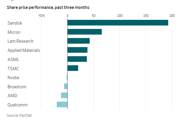 因此,存储器价格正在飙升。Counterpoint Research表示,今年第一季度以来,价格已上涨80%至90%。这对那些需要采购内存的公司来说是不利的,但对内存芯片制造商和为其提供设备的公司来说则是大利好。闪存制造商闪迪过去三个月市值几乎翻了三倍,美光科技上涨了66%。而专注于内存领域的芯片制造设备公司科磊,股价上涨超过40%。