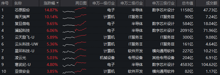 成份股方面,芯原股份领涨超14%,海天瑞声涨逾10%,复旦微电涨超9%,澜起科技、云天励飞、云从科技、寒武纪等个股大幅跟涨。