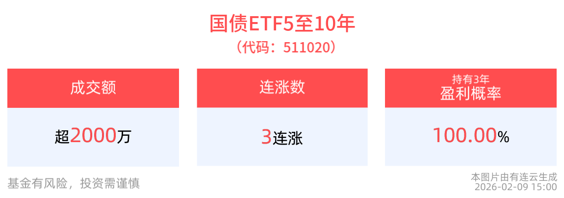 截至2026年2月9日 15:00,中证5-10年期国债活跃券指数(净价)(H21018)上涨0.03%。国债ETF5至10年(511020)上涨0.08%, 实现3连涨。最新价报116.1元。拉长时间看,截至2026年2月9日,国债ETF5至10年近1周累计上涨0.23%。
