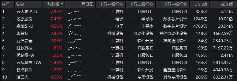 成份股方面,云天励飞、芯原股份领涨超7%,寒武纪涨逾4%,奥普特、亚信安全涨超2%,虹软科技、优刻得、云从科技等个股大幅跟涨。