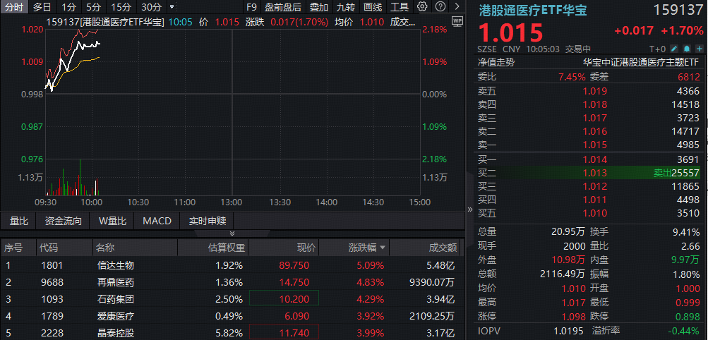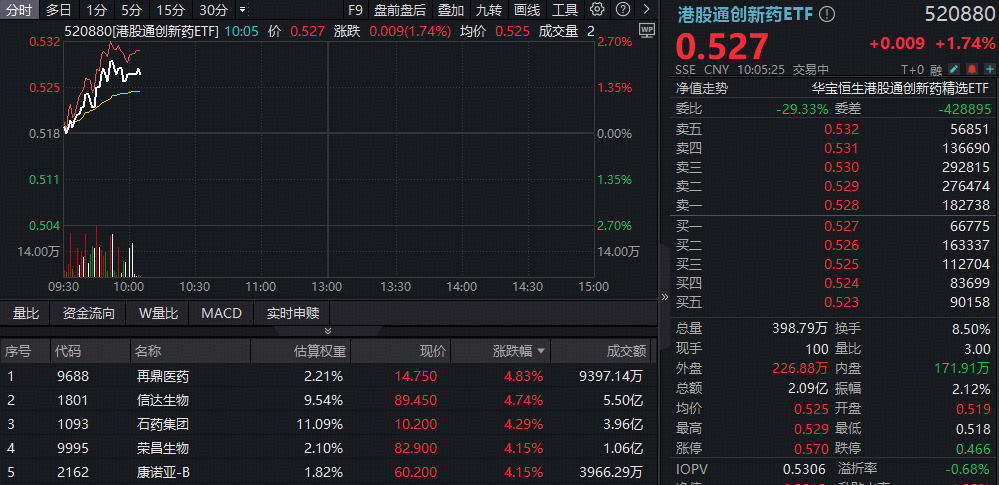 ETF盘中资讯|从预期到兑现,港股医药持续修复!港股通创新药ETF(520880)、港股通医疗ETF(159137)携手冲击2%