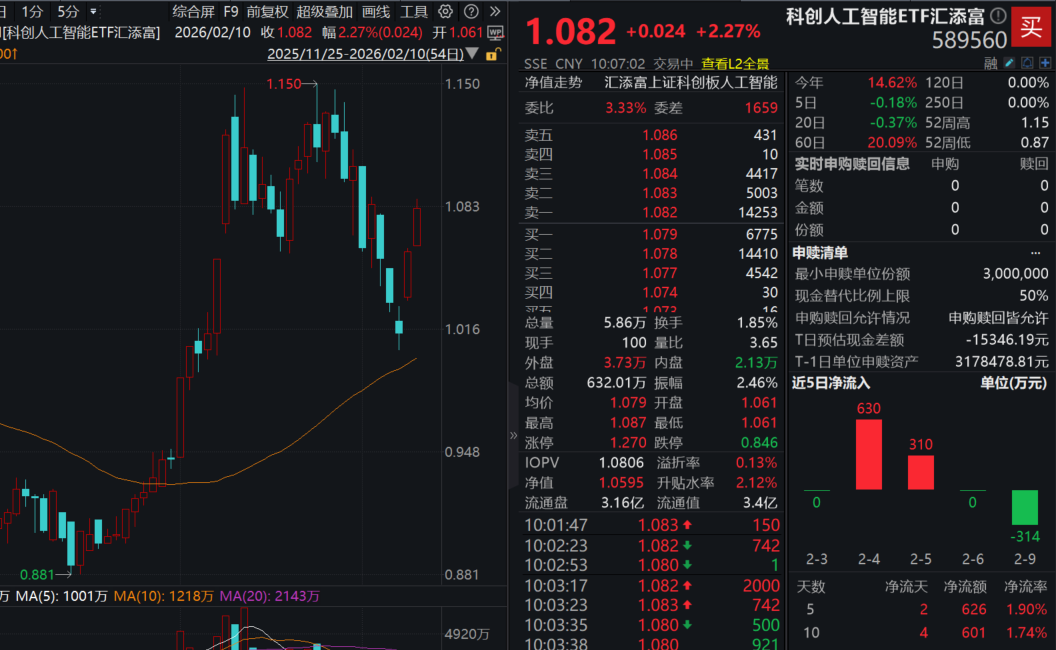 2月10日,A股市场震荡,硬科技板块逆势冲高!截至9:49,科创芯片ETF汇添富(588750)直线飙升,涨超2%!资金强势涌入,科创芯片ETF汇添富(588750)昨日强势吸金超5700万元!
