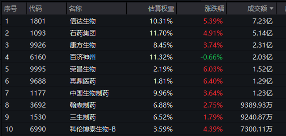 港股通创新药ETF(159570)标的指数热门股多数飘红:荣昌生物、再鼎医药涨超6%,信达生物涨超5%,石药集团涨近5%,康方生物、中国生物制药涨超3%。