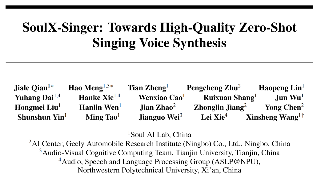 工业级稳定可用、零样本歌声合成,Soul App 联合吉利汽车研究院人工智能中心(AIC)、天津大学及西北工业大学开源SoulX-Singer