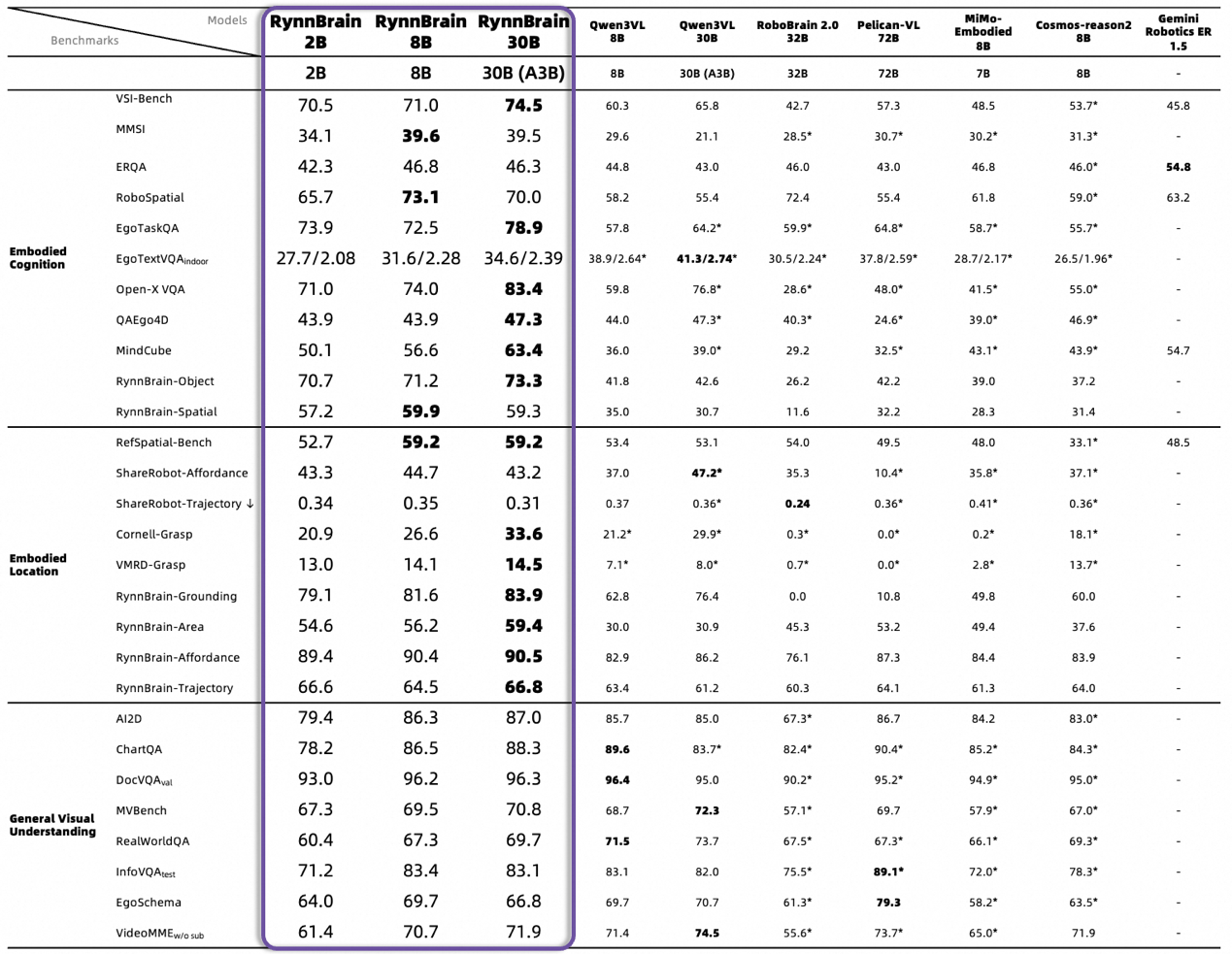 RynnBrain在Qwen3-VL基础上训练,使用自研的RynnScale架构进行训练优化,同等资源加速两倍,训练数据超过2000万对。结果显示,RynnBrain能力全面,性能领先,在16项具身开源评测榜单上刷新纪录(SOTA),包括环境感知与对象推理、第一人称视觉问答、空间推理、轨迹预测等,超越了谷歌Gemini Robotics ER 1.5、英伟达 Cosmos Reason 2等具身顶尖模型。