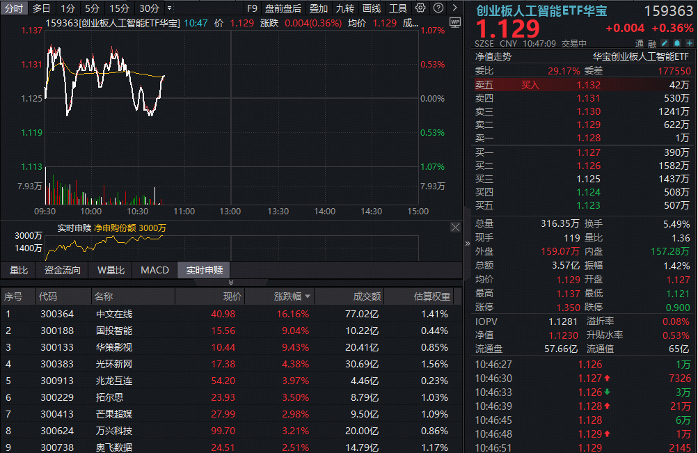 热门ETF方面,昨日暴涨超6%后,双线布局“算力 AI应用”的创业板人工智能ETF(159363)红盘震荡,资金交易活跃,实时成交额超3.5亿元,资金进场抢筹2600万份。