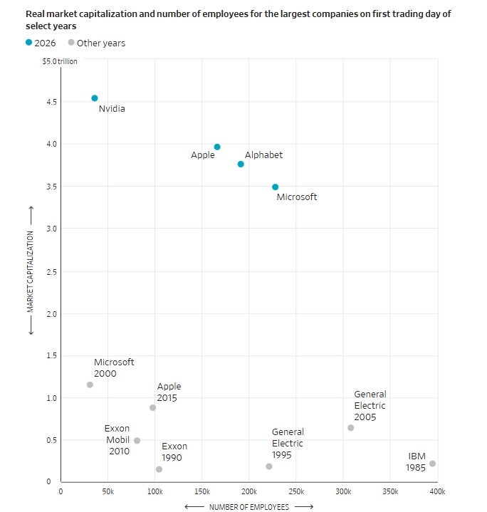 如今,英伟达的市值是当年IBM(按通胀调整后)的近20倍,利润是其5倍,但员工人数却只有IBM的十分之一左右。