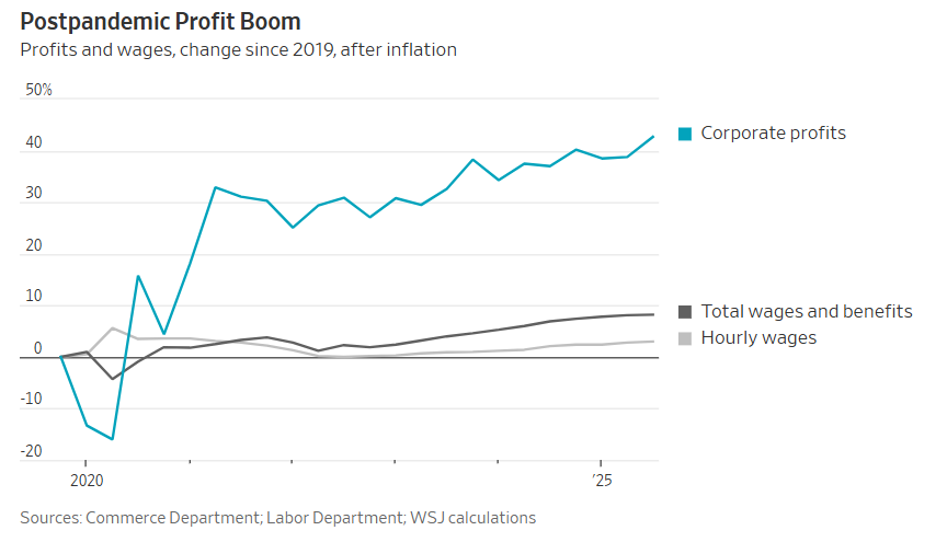 自2019年末疫情爆发前以来,工人总体上仅勉强跟上了通胀。扣除通胀后,平均时薪上涨3%;总薪酬增长8%。相比之下,企业利润则飙升了43%。