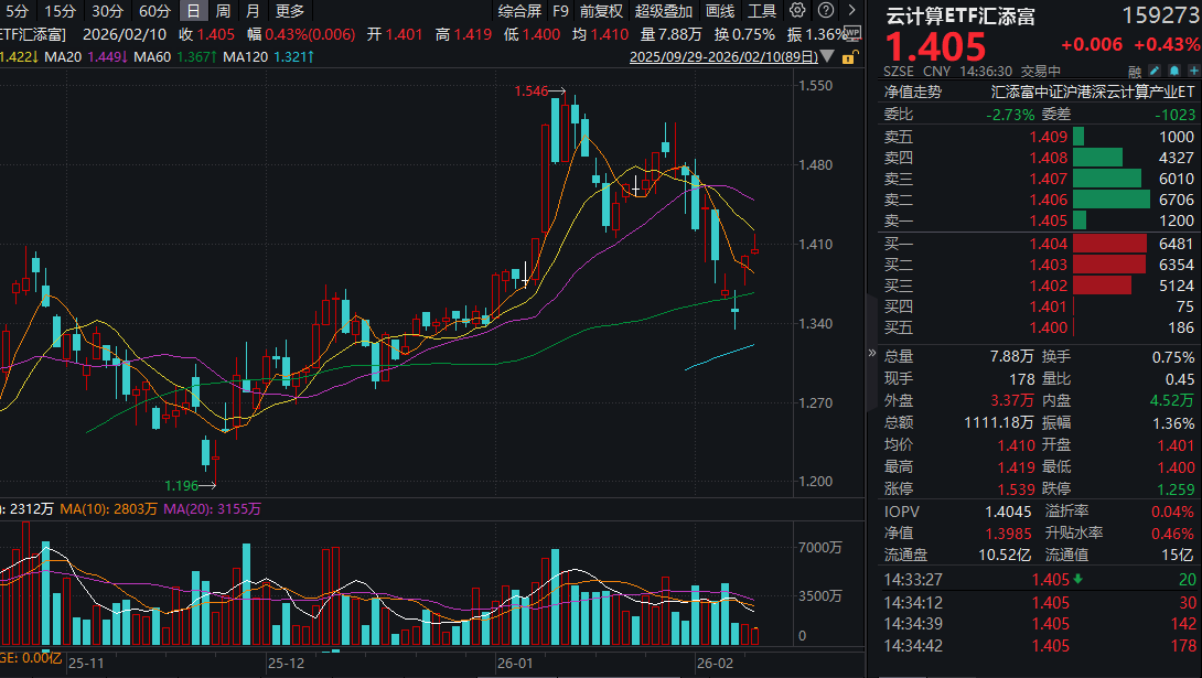 2月10日,A股算力板块再度走强,“算力ETF”云计算ETF汇添富(159273)涨0.43%冲击两连阳!资金持续青睐,近20日狂揽超1.7亿元!热门成分股中,IDC概念火爆,光环新网涨超6%,数据港涨超5%。新易盛、阿里巴巴-W涨超1%。