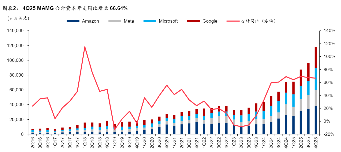 北美四大云厂商(MAMG,微软、亚马逊、Meta、谷歌)近日已发布25业绩,MAMG 25年合计资本开支同比增长67.06%至3725.52亿美元,Factset一致预期26年资本开支将达到5707.67亿美元(同比 53.2%)。各家保持对26年资本开支的积极指引:1)微软预计2026年全年的资本支出约为1152亿美元;2)亚马逊预计2026年全年的资本支出约为1613亿美元;3)Meta预计2026年全年的资本支出约为1237亿美元;4)谷歌预计2026年全年的资本支出约为1705亿美元。