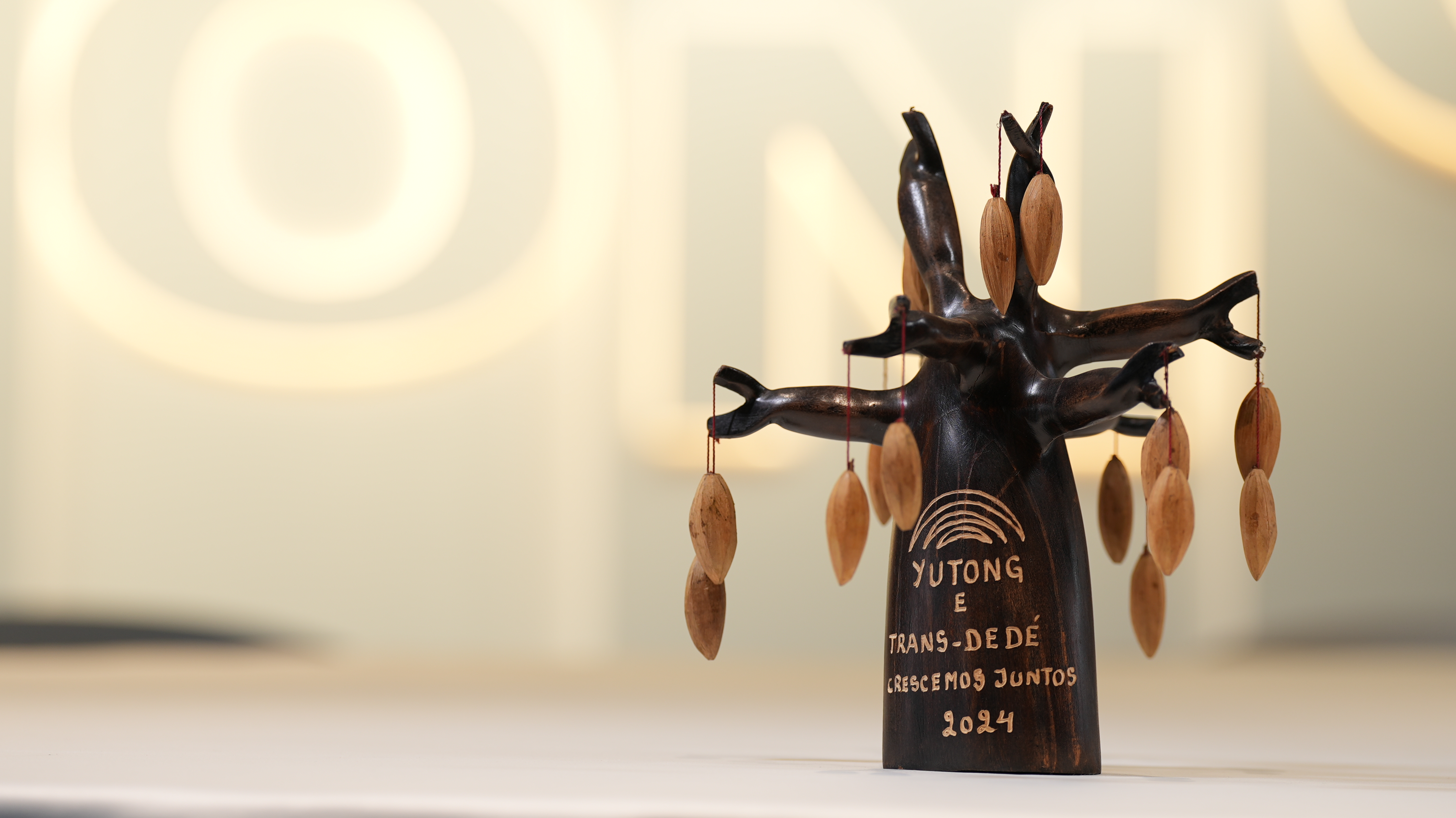 后来,客户把这尊木雕赠送给我们,这上面挂着象征着友谊与和平的橄榄核,树身上刻着我们与客户公司的名称,还有一行葡萄牙语“CrescemosJuntos”,意思是共同成长。他说,猴面包树,能在最干旱的环境里屹立千年,是“生命之树”。这份礼物背后是客户对我们的三重认可,认可了宇通车的可靠品质,认可了团队扎根当地永不言弃的诚意,更认可了宇通作为一个品牌带来的持久生命力。现在宇通客车不光驰骋在全球各个市场,还在16个国家建立了KD工厂,实现了本地化生产,并将售后网络覆盖全球。