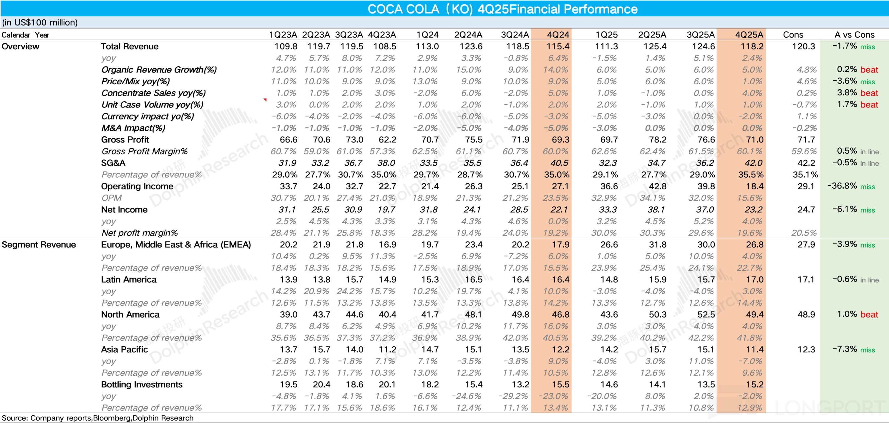 4Q25 可口可乐实现表观营收 118.2 亿美元,同比增长 2.4%,不及预期。其中公司内生营收(Organic revenue)增长 5%。