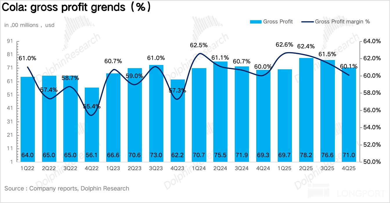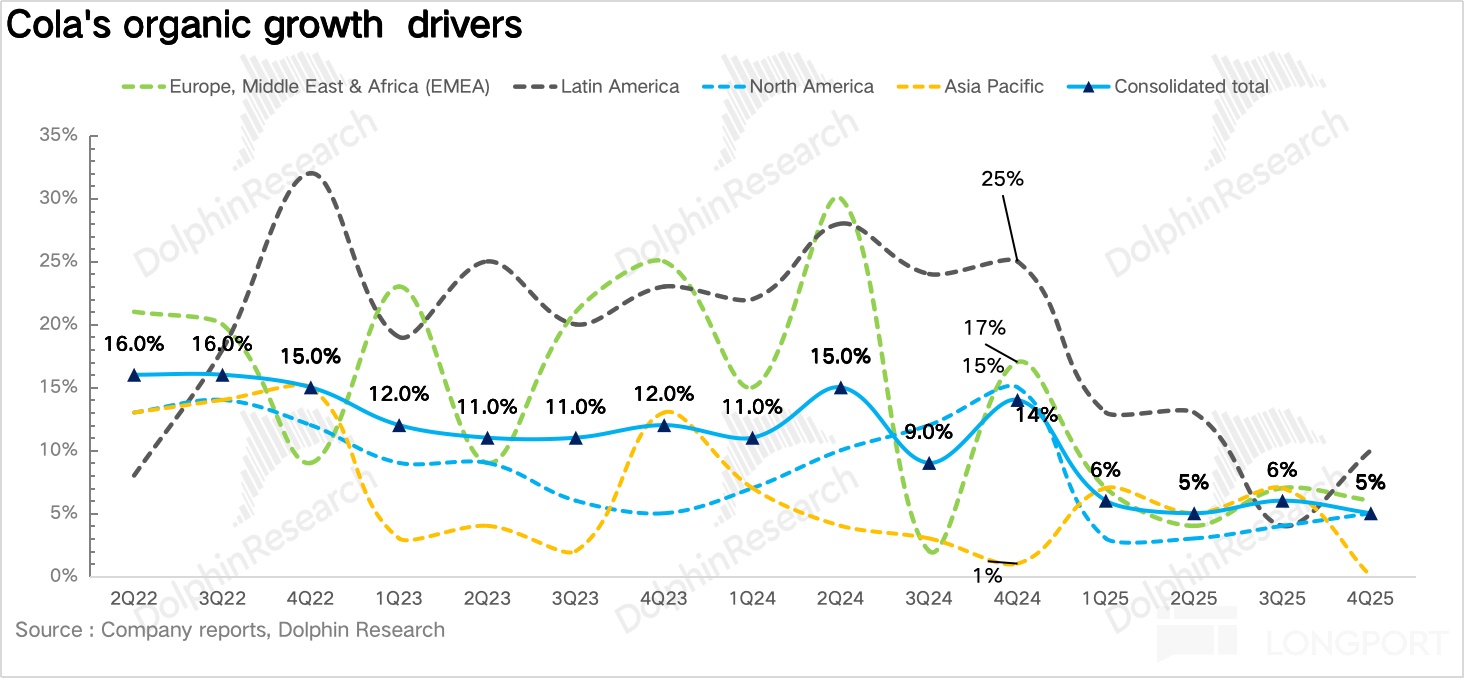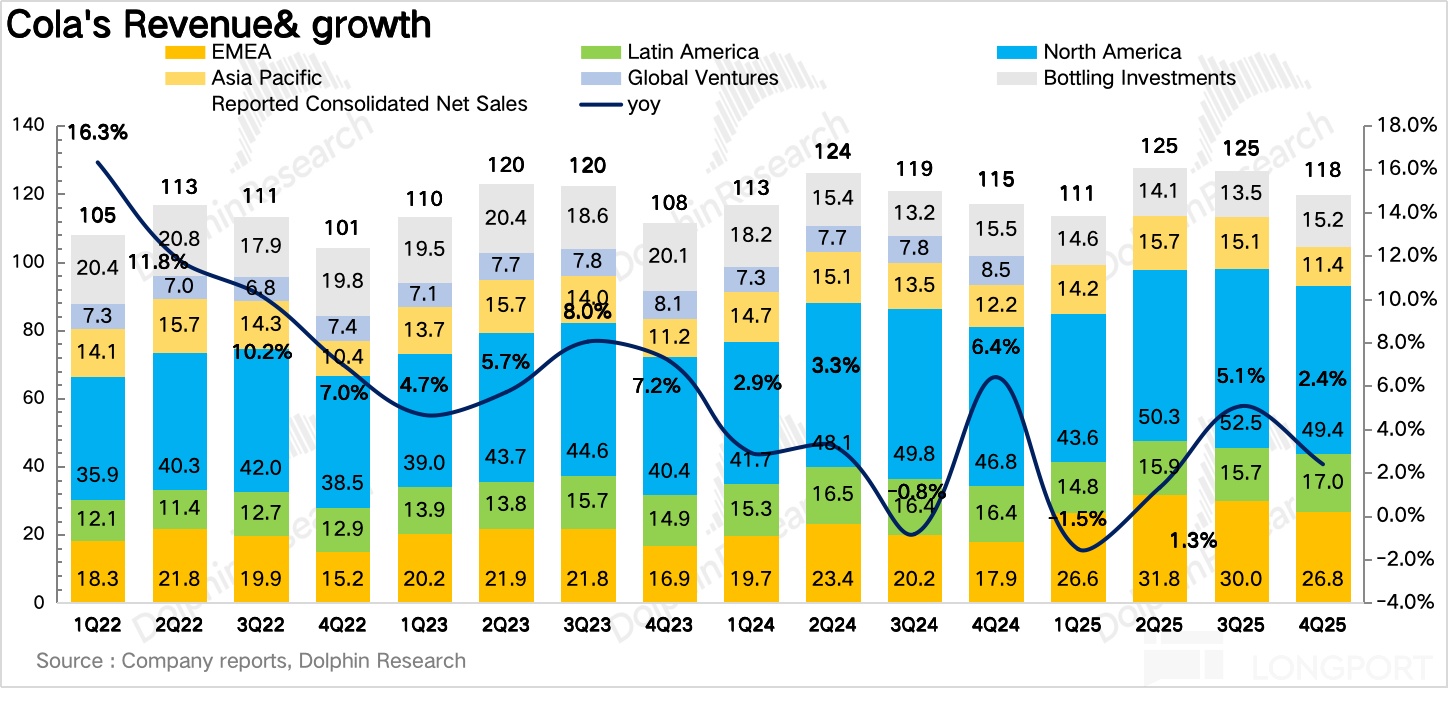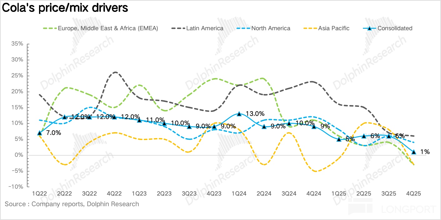 1、价格增长不及预期。4Q25 可口可乐实现表观营收 118.2 亿美元,同比增长 2.4%,不及预期。其中公司内生营收(Organic revenue)增长 5%,量价拆分看,浓缩液销量同比增长 4%,但如果和单位箱销量 1% 的增速结合一起去看,海豚君推测主要是瓶装商提前备货所致。价格端作为公司此前内生增长的核心引擎,Q4 仅增长了 1%,核心在于去年同期依靠通胀被动提价的红利消退逐步回归温和增长
