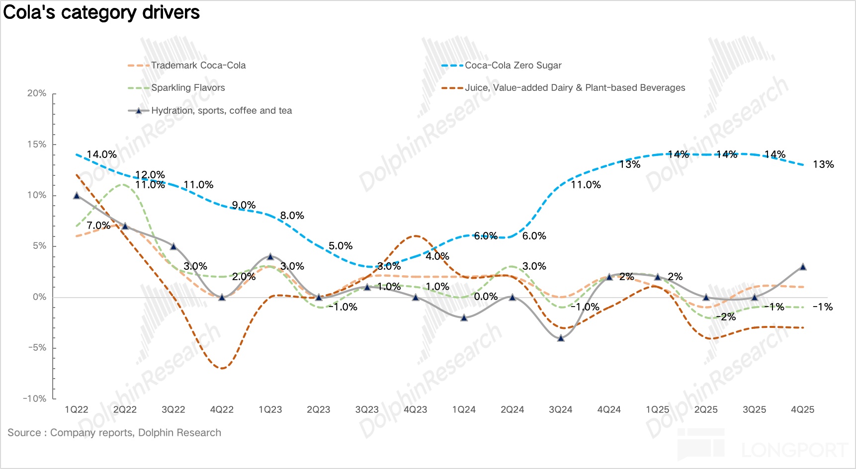 量:4Q25 浓缩液销量同比增长 4%。和三季度类似,和健康相关的品类包括零糖、Fairlife、能量饮料仍然是可口可乐销量端的核心增长引擎。