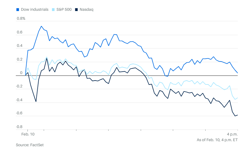 投资者静待推迟发布的一月就业报告。道琼斯工业指数连续第三个交易日创下历史收盘新高,上涨52点,涨幅0.1%。标普500指数下跌0.3%。纳斯达克综合指数下跌0.6%,结束了此前连续两天的反弹走势。