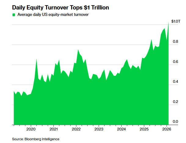 与此同时,美国股市的交易量激增,每日成交额突破1万亿美元,成为新常态,显示出市场参与度全面上升。彭博情报数据显示,今年1月股票换手率平均达1.03万亿美元,较2025年同期增长约50%,创下新纪录。期间每日成交股份超过190亿股,为历史第二高。