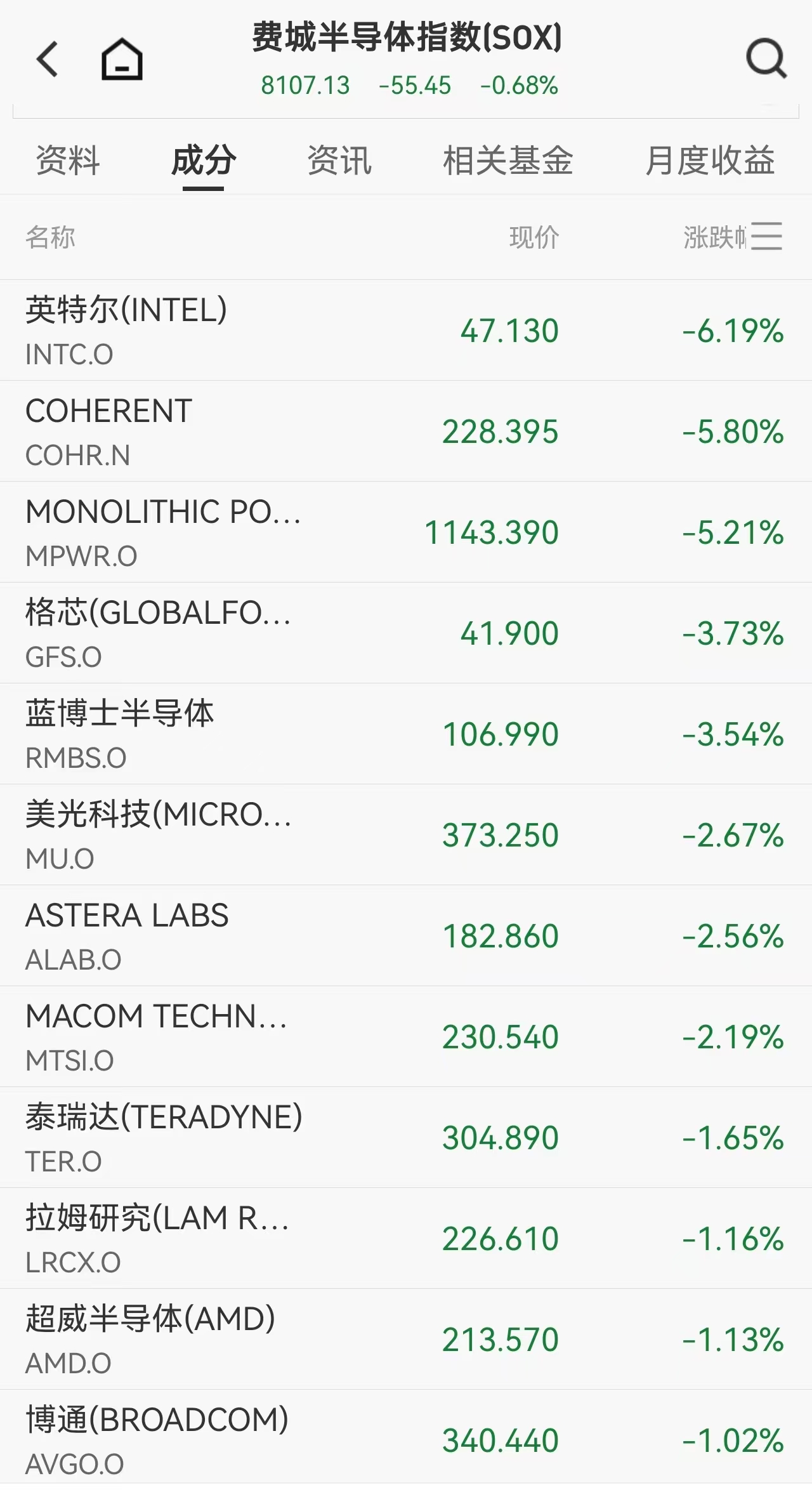 大型科技股成为当日市场焦点,万得美国科技七巨头指数下跌0.59%,英伟达、苹果、微软等龙头股普遍收跌。其中,英特尔因业绩预期不佳重挫6.19%,美光科技、西部数据等存储概念股跌幅更超3%,反映市场对高资本开支下AI投资回报的担忧。