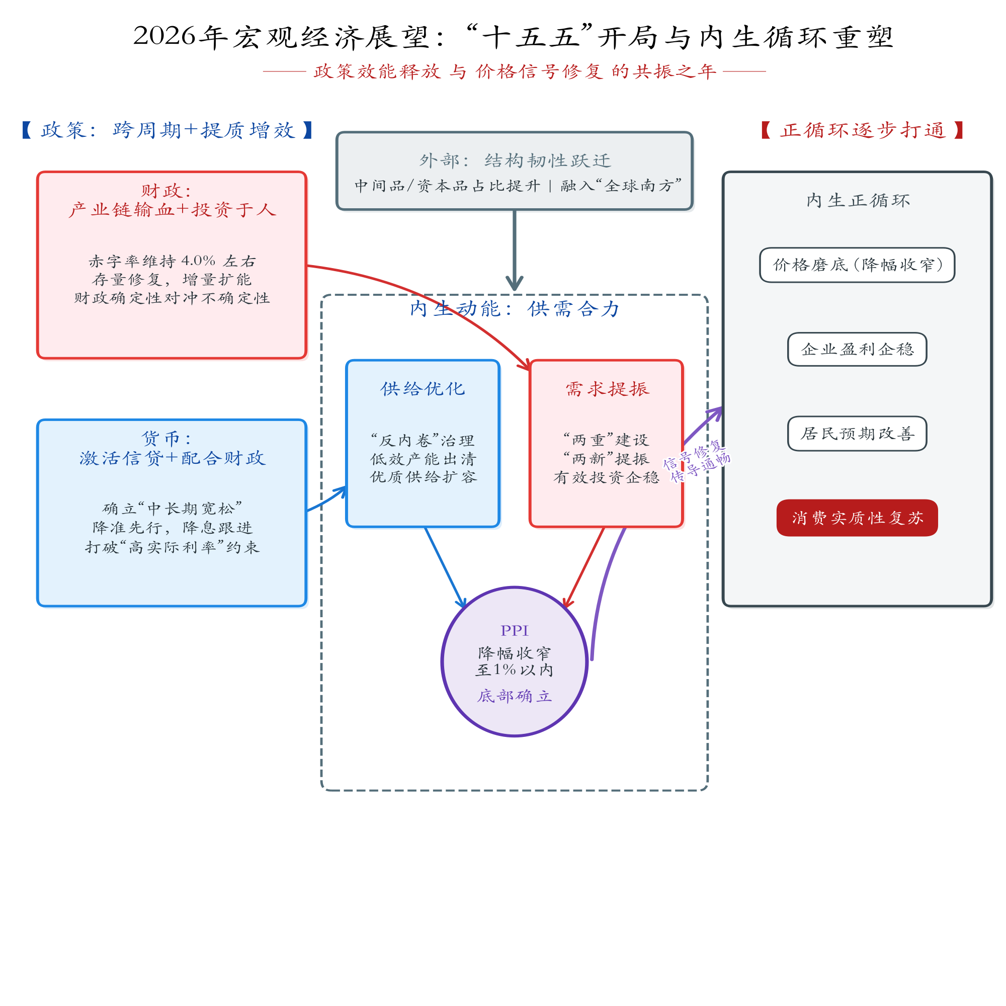 2026年是“十五五”规划的开局之年。展望全年宏观经济走势,核心在于宏观调控底层逻辑正在发生的深刻重构,政策目标不再局限于熨平短期波动,而是通过多重工具的精准协同促进微观主体的资产负债表修复,驱动新旧动能的平稳接续。2026年宏观经济将呈现出财政定力与货币弹性、投资先行与消费筑底、国内“反内卷”治理与全球版图重构的深度共振,同时也标志着中国经济正式步入由量向质、主动重塑转型的关键航道。