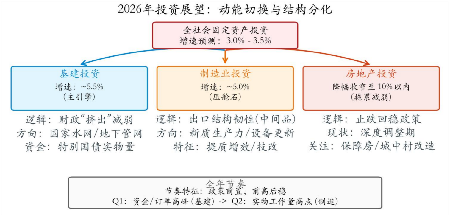 在2026年的宏观叙事中,推动固定资产投资的“企稳回升”是打破总需求不足僵局、启动经济正向循环的关键。回顾2025年,投资增速承压是“地产深度调整、基建资金被挤占、价格低迷拖累盈利”三股负向力量共振的结果。展望2026年,随着三大制约因素的边际缓解,预计全社会固定资产投资增速将从低位回升至3.0%-3.5%的区间。节奏上,全年将呈现鲜明的“政策前置”与“前高后稳”特征:受“十五五”规划开局效应与超长期特别国债持续发力的驱动,一季度将迎来资金投放与订单下达的高峰;随着财政“化债清欠”资金的快速拨付,建筑业与中上游企业的现金流将率先修复。传导上,前期积压的政策效能将在二季度加速转化为实物工作量,形成全年投资的结构性高点。值得注意的是,制造业投资的内生性修复依赖于PPI价格信号的回暖,因此2026年的投资复苏将呈现“基建领跑搭台,制造业跟跑唱戏”的接力特征。