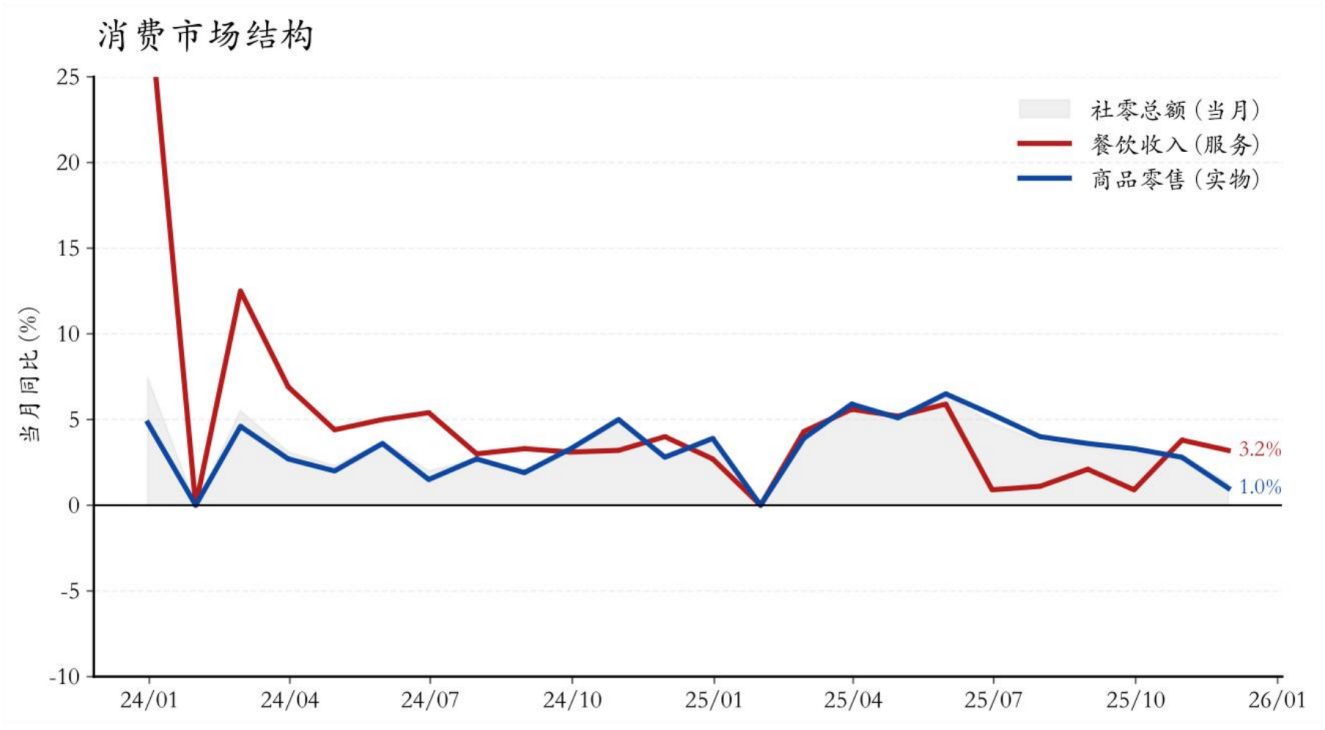 2026年消费将步入由集中刺激向常态化增长切换的“换挡期”,预计全年社零增速将在4.0%-4.5%区间温和运行,这一增速背后是资产负债表修复期特有的“结构性分化”与“弱平衡”。一方面,耐用品消费高位整固。 得益于以旧换新政策的连续性与长效化,汽车、家电等大宗消费底部有支撑,不会失速;但受高基数与提前透支影响,边际拉动作用将趋缓,回归至“平稳置换”常态,不再是弹性的主要来源。另一方面,服务消费将成为“最大边际增量”。 2026年扩内需政策重心预计将向服务消费倾斜,养老育幼与文旅体育将是政策发力的重点。叠加假日制度优化的潜在利好,“假日经济”将有效打破居民时间约束,释放被压抑的体验式需求。