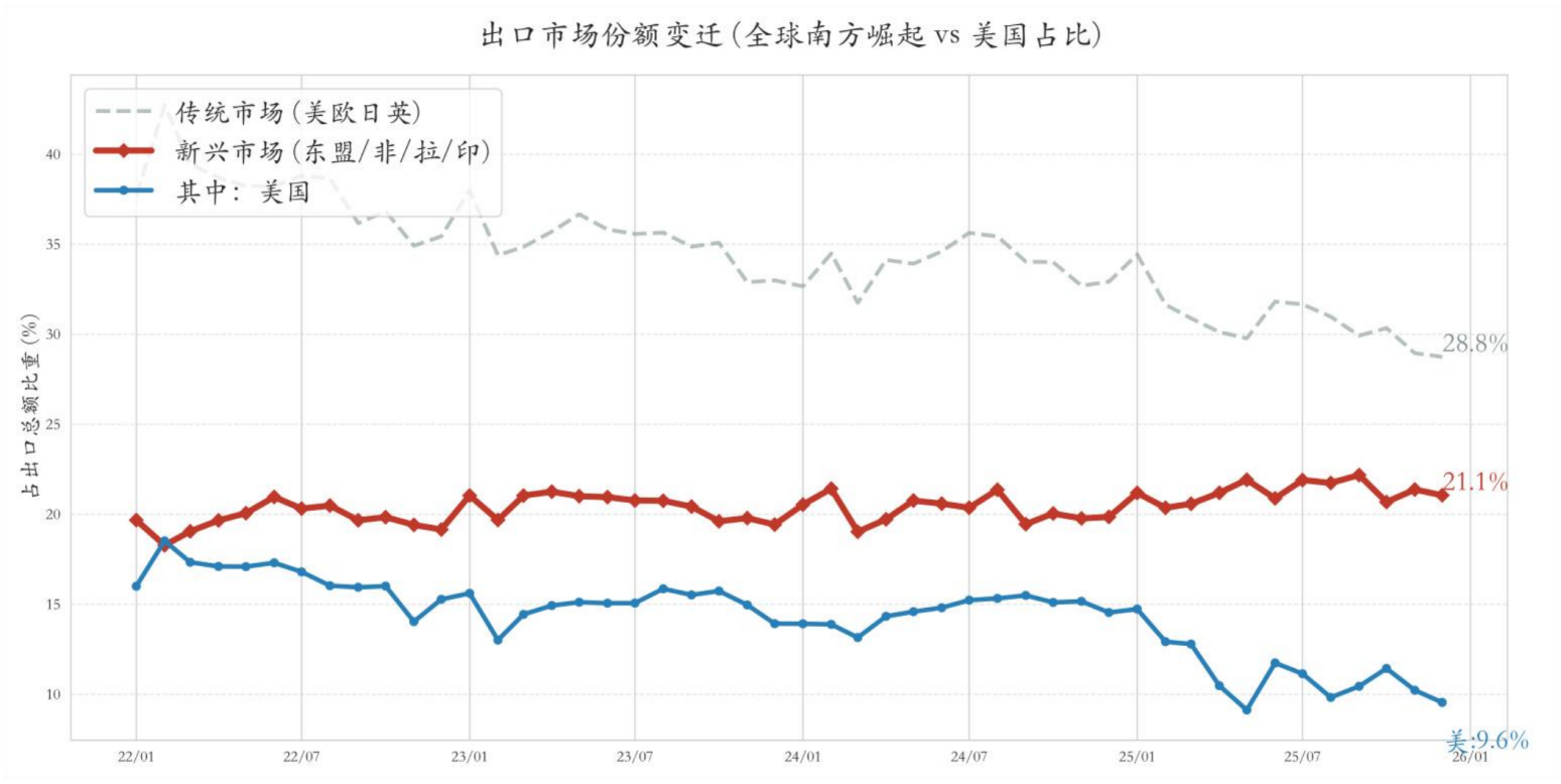 2026年的外部环境依然复杂,但我国出口将依托贸易版图的重构展现出极 强的结构性张力 。通过深化与东盟 、非洲 、拉美及 “一带一路 ”沿线国家的产能合作,外贸范式正从单一的货物贸易向 “技术 产能 ”的复合输出转型。除了产品份额的提升,我国正深度嵌入 “全球南方 ”的工业化进程,这种通过 “装备出海 ”与 “供应链在地化 ”构建的利益共同体,远比单纯的产品买卖更具黏性与抗风险能力 。2026年,这种 “产能共生 ”模式将有效对冲发 达经济体的需求扰动,成为维持出口合理增速 、实现内外均衡的坚实底盘。(来源:五矿信托)