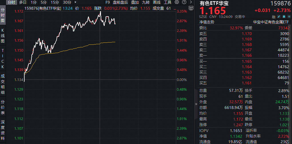 有色金属板块热门ETF——有色ETF华宝(159876)强势上攻,场内涨幅盘中上探3.35%,现涨2.73%,实时成交额6618万元,当前成交额已超昨日全天,交投火热!