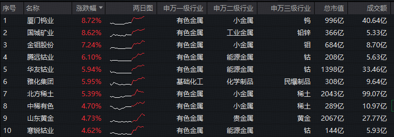 成份股方面,小金属方向显著领涨,厦门钨业、国城矿业领涨超8%,金钼股份涨逾7%,腾远钴业涨超6%,华友钴业、雅化集团、北方稀土等个股跟涨。
