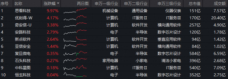 成份股方面,思看科技领涨超9%,优刻得涨逾4%,奇安信、安路科技等个股跟涨。另一方面,澜起科技跌超3%,凌云光跌逾2%,寒武纪跌超1%,跌幅居前,拖累指数表现。