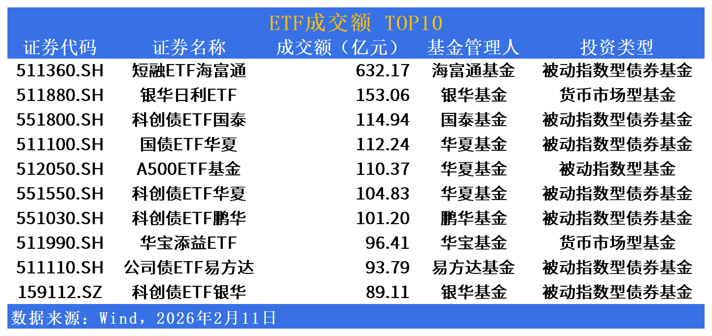 固收类ETF持续获得资金青睐,海富通短融ETF(511360.SH)单日成交额高达632.17亿元,稳居市场首位;银华日利ETF(511880.SH)成交153.06亿元。债券型产品成交活跃,国泰科创债ETF(551800.SH)成交114.94亿元,华夏国债ETF(511100.SH)成交112.24亿元,鹏华科创债ETF(551030.SH)成交101.20亿元,易方达公司债ETF(511110.SH)成交93.79亿元。权益类产品中,华夏A500ETF基金(512050.SH)成交110.37亿元。