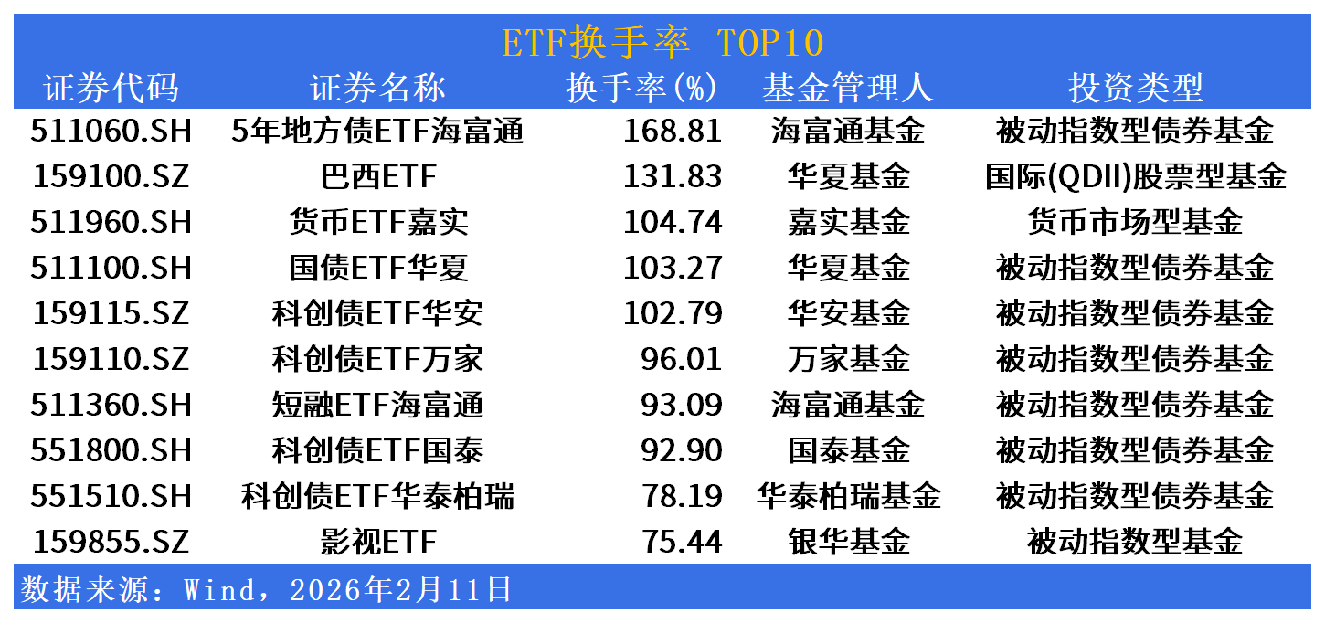 换手率方面,海富通5年地方债ETF(511060.SH)换手率达168.81%,华夏巴西ETF(159100.SZ)换手率131.83%,跨境与债券品种交易热度居高不下。华夏国债ETF(511100.SH)换手率103.27%,华安科创债ETF(159115.SZ)换手率102.79%,万家科创债ETF(159110.SZ)换手率96.01%,科创债ETF集群维持高换手状态。