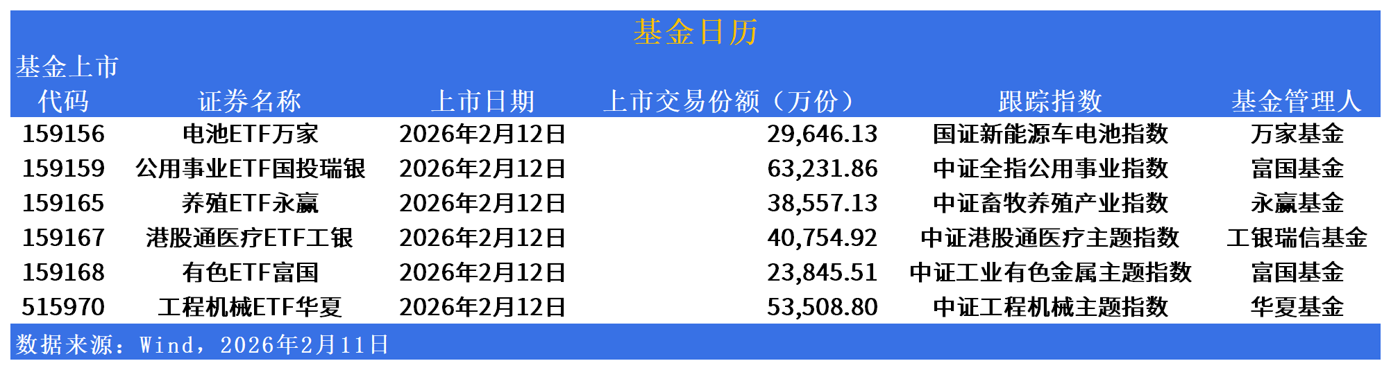 明日(2月12日)将有六只ETF同日上市,涵盖新能源车电池、公用事业、畜牧养殖、港股医疗、工业有色及工程机械六大细分领域: