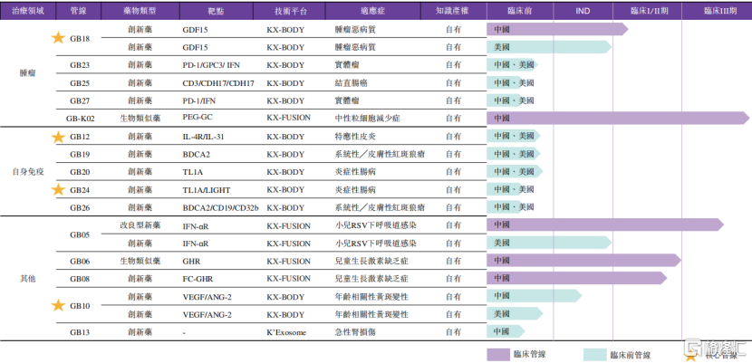 在肿瘤领域,公司已开发出针对肿瘤恶病质的GB18(GDF15单抗);GB23(PD-1/GPC3/IFN三特异性抗体融合蛋白)用于实体瘤;GB25(CD3/CDH17/CDH17双特异性三抗T细胞连接器)用于结直肠癌;及GB27(PD-1/IFN双靶抗体融合蛋白)用于实体瘤。