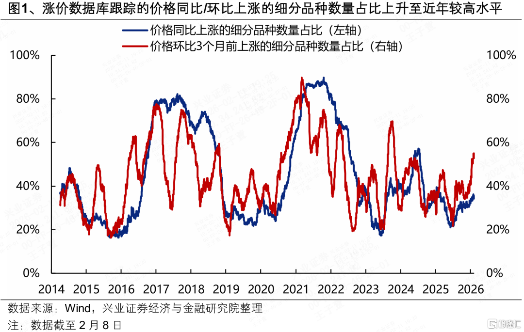 我们在2026年度策略《万物竞发》中强调,物价回升将是支撑2026年企业盈利改善、甚至影响市场风格的最重要的逻辑。年初以来,我们也从宏观数据验证、微观线索梳理、日历效应等维度,反复提示涨价链的机会(详见2.8《持股过节吗?》、1.28《近期涨价链的三条线索》等)。