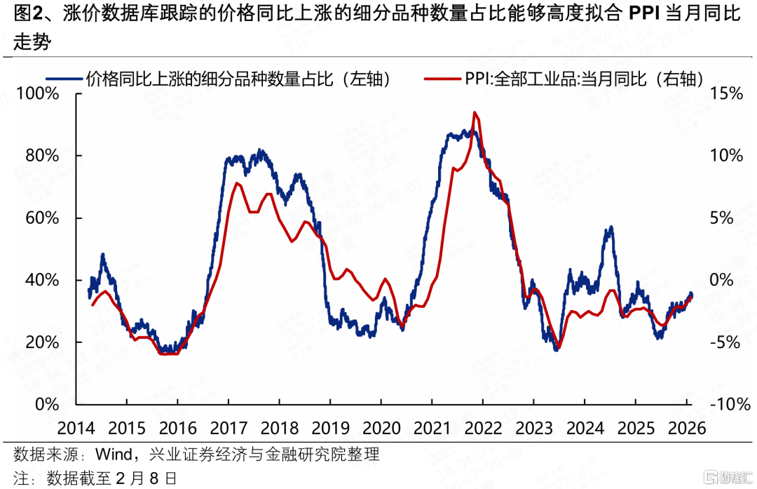 开年第一份通胀数据正在验证本轮物价改善的动能,与我们跟踪的高频涨价数据指向的信号一致。尤其是与企业盈利更加相关的PPI同比创2024年8月以来新高、环比创2023年10月以来新高,与我们跟踪的高频涨价数据指向的信号一致:我们跟踪的【全行业价格数据库】覆盖的321个细分品种中,价格同比/环比上涨的细分品种数量占比均上升至近年较高水平。走势来看,价格同比上涨的细分品种数量占比能够高度拟合PPI当月同比走势。