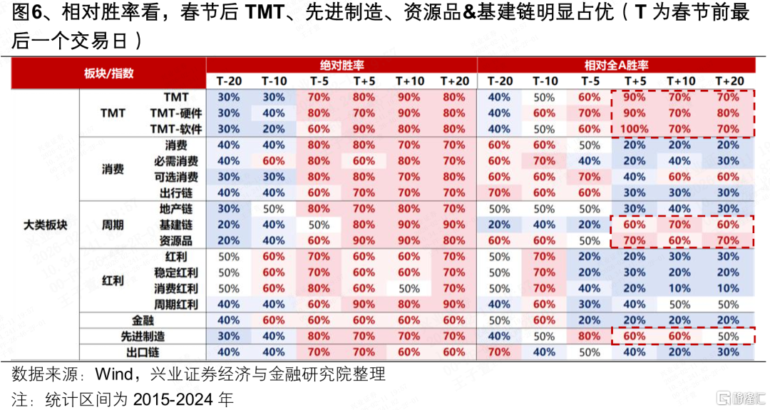 往后看,从日历效应角度,节后是验证涨价、交易涨价的重要窗口。随着春节后步入“金三银四”春季开工旺季、叠加3月两会后政策集中落地,后续将是涨价线索进一步丰富的关键窗口。因此,一季度也有望是本轮PPI是否能够企稳上行的关键验证窗口,历史上国内几轮通胀周期PPI的加速上行的时间都是在一季度。在涨价线索丰富、宏观数据验证的提振下,资源品&基建链节后胜率也明显提升。