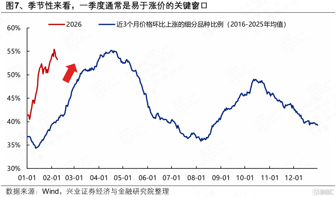 细分品种看,近期涨价呈现出范围更广、线索更加丰富的特征,国际大宗商品价格传导、政策“开门红”、“反内卷”、科技产业趋势均有贡献。1月PPI环比提升较多的细分行业主要集中在有色金属、非金属矿物制品(建材等)、黑色金属、科技制造、化学纤维、农副食品加工等,与我们高频跟踪的涨价细分品种形成对应。可以看到,不仅国际大宗商品价格传导带来的输入性通胀继续对国内物价回升形成贡献,随着政策“开门红”、“反内卷”深化、科技产业趋势持续迭代,国内涨价线索也在愈加丰富。在我们【全行业价格数据库】跟踪的细分品种中,以近3个月环比上涨的细分品种比例来衡量,今年年初涨价线索的丰富程度在2016年以来仅次于2017年供给侧改革时期,以及2021年通胀大幅上行时期。