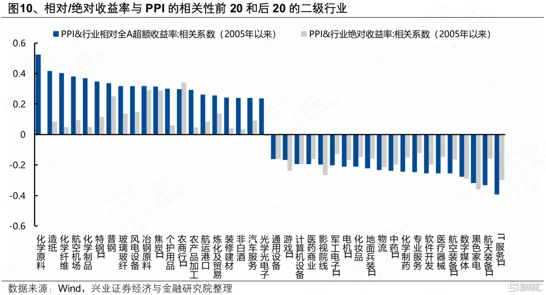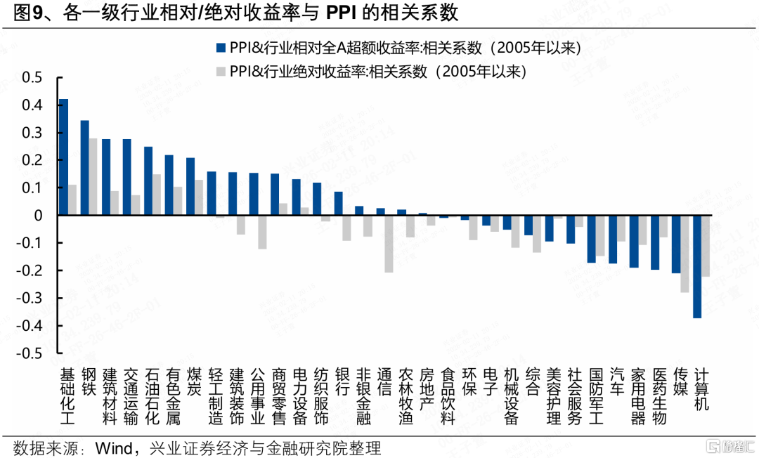 如果数据持续验证价格改善,需要提升对顺周期的重视。我们统计了各一级和二级行业股价与PPI的相关性,相对收益率与PPI正相关性居前的行业包括:化工、钢铁、建材(玻璃玻纤、装修建材)、交运(航空机场、航运港口)、石化、有色、煤炭,此外还有造纸、风电设备、个护用品、农商行等细分行业。