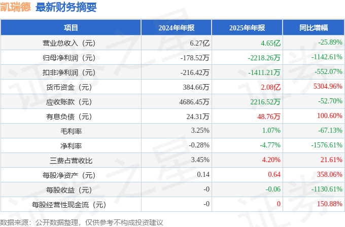 据证券之星公开数据整理,近期凯瑞德(002072)发布2025年年报。根据财报显示,凯瑞德净利润同比下降1142.61%。截至本报告期末,公司营业总收入4.65亿元,同比下降25.89%,归母净利润-2218.26万元,同比下降1142.61%。按单季度数据看,第四季度营业总收入8228.58万元,同比下降34.34%,第四季度归母净利润-105.49万元,同比下降241.05%。