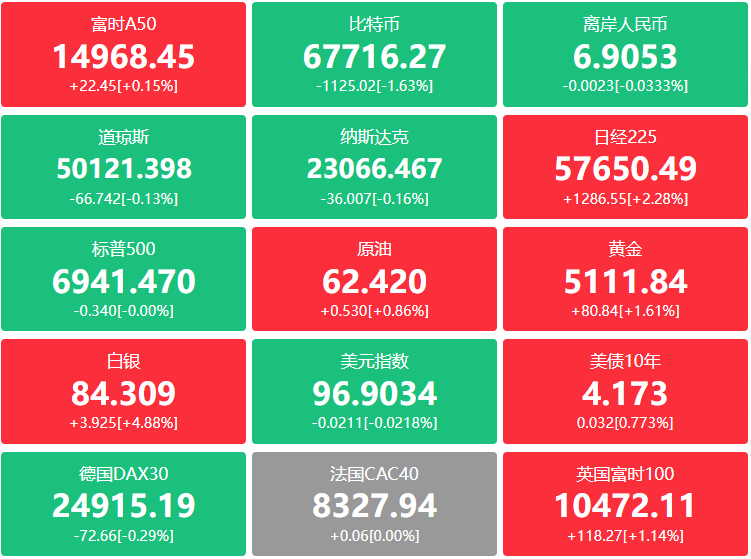 期货:现货黄金涨1.06%报5078.98美元;黄金期货涨1.48%报5105.43美元;现货白银涨4.20%报84.2080美元,白银期货涨4.42%报83.935美元;铜期货涨1.27%报5.9885美元;现货铂金涨2.48%,现货钯金涨0.61%;原油期货涨0.67美元,涨幅1.05%报64.63美元;布伦特原油期货涨0.60美元,涨幅0.87%报69.40美元;天然气期货报3.1590美元;汽油期货报1.9789美元;取暖油期货收报2.4404美元。