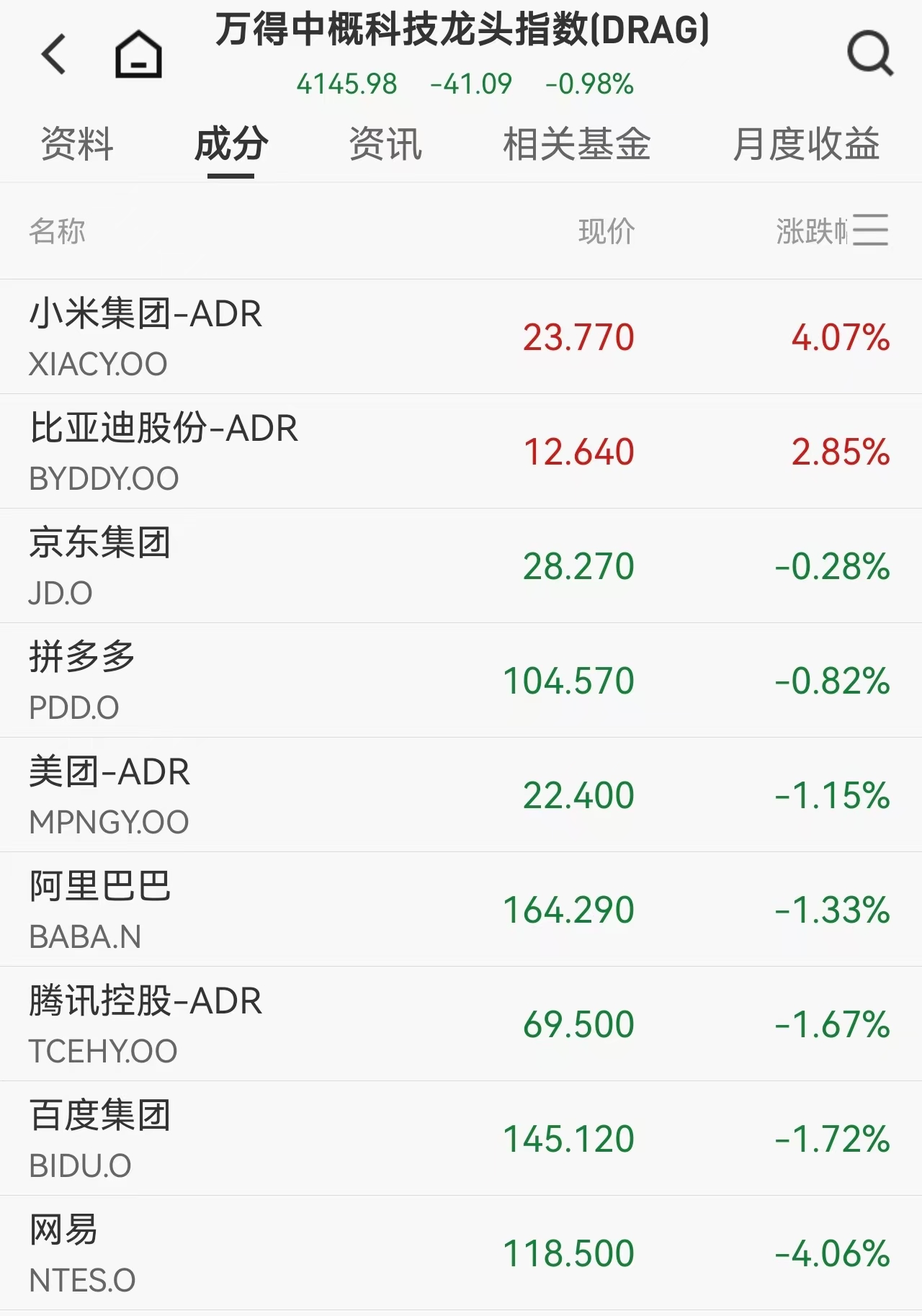 中概股多数走弱,纳斯达克中国金龙指数跌0.65%,网易跌超4%,虎牙、晶科能源跌超5%,百度、阿里巴巴分别跌1.72%、1.32%,拼多多、京东小幅下跌。不过部分中概股逆势走高,世纪互联涨超12%,金山云涨9.98%,哔哩哔哩涨2.84%,蔚来、小鹏、理想等造车新势力均涨超 1.6%,名创优品、华住集团等消费类标的也录得2% 以上的涨幅。