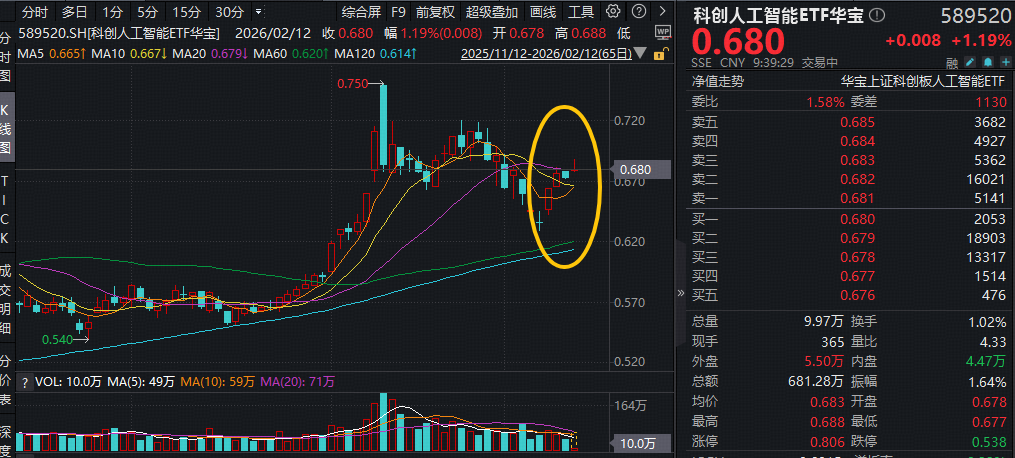 今日(2月12日)AI方向涨势如虹,重点布局国产AI产业链的科创人工智能ETF(589520)场内涨幅一度上探2.38%,现涨1.19%,盘中收复20日均线。值得关注的是,昨天该ETF单日吸金404万元