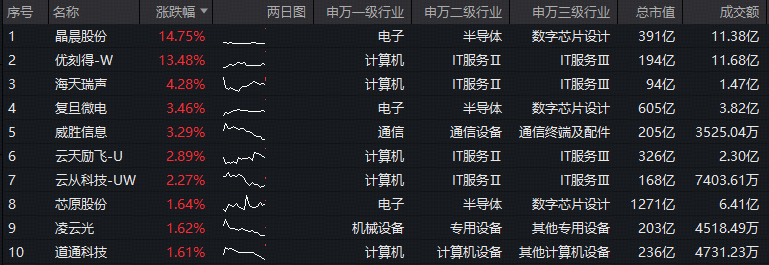 成份股方面,晶晨股份领涨超14%,优刻得涨逾13%,海天瑞声涨超4%,复旦微电、威胜信息涨逾3%,云天励飞、云从科技等个股跟涨。